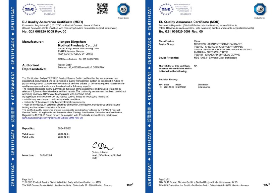 Dingshun Medical nyní prošel mnoha mezinárodními certifikacemi včetně CE, MDR, FDA, ISO13485 a ISO9001.